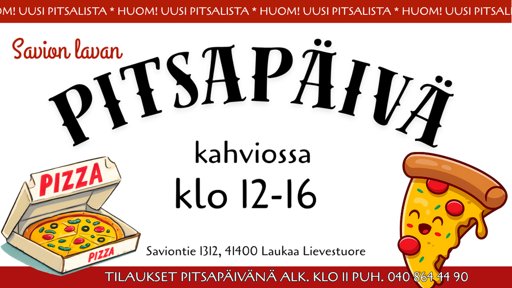 Pitsapäivänä voit tilata pitsan ja tulla noutamaan sen kotiin tai tulla paikan päälle syömään. Pitsoja voi tilata puhelimitse samana päivänä tai paikan päällä. Kahviossa oheisohjelmana ilmainen BINGO.