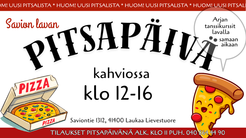 Pitsapäivänä voit tilata pitsan ja tulla noutamaan sen kotiin tai tulla paikan päälle syömään. Pitsoja voi tilata puhelimitse samana päivänä tai paikan päällä. Kahviossa oheisohjelmana ilmainen BINGO. Lavalla oheistoimintana Arjan tanssikurssit.