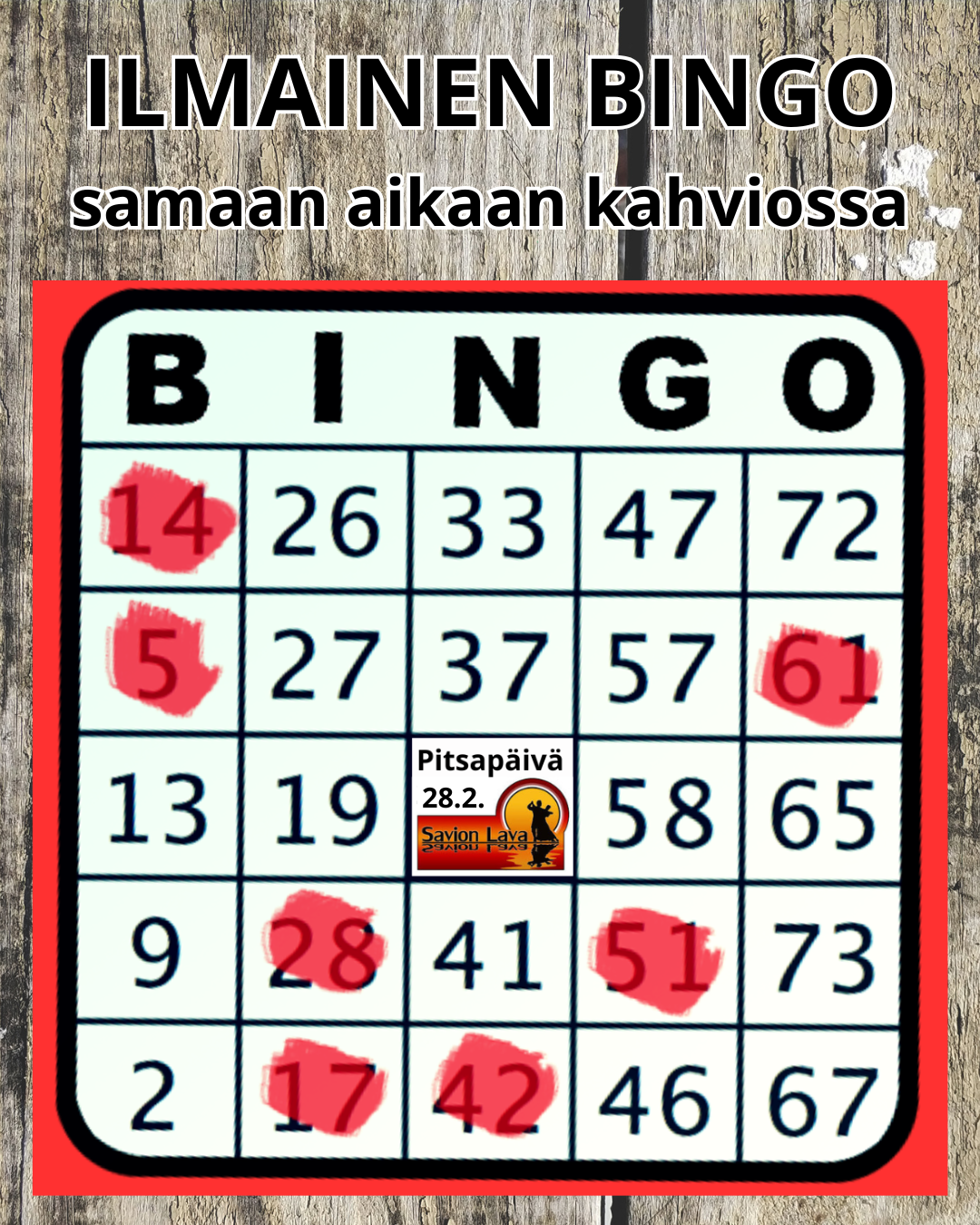 Pitsapäivänä kahviossa on oheisohjelmana ilmainen BINGO johon halutessasi osallistua - samaan aikaan pitsan paistuessa valmiiksi.